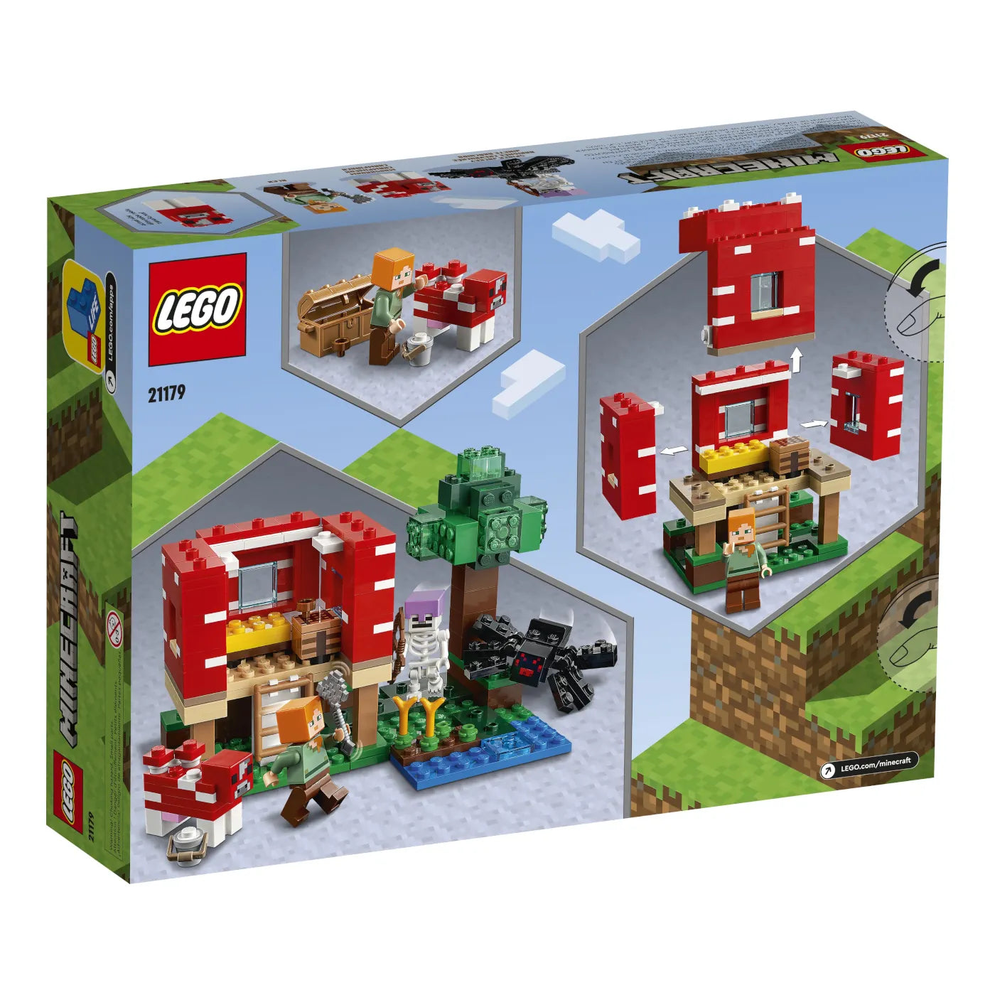 Minecraft Fans können im riesigen Pilzhaus kreativ werden. Die Wände und das Dach lassen sich abnehmen, um Zugang zur Werkbank und zu den Möbeln zu erhalten. Draußen benutzt die Minecraft Heldin Alex eine Schüssel, um Suppe von der Pilzkuh zu holen. Doch ein Spinnenreiter durchkreuzt dieses Vorhaben. In diesem Minecraft Pilzhaus erwarten Kinder unzählige fantasievolle Spielmöglichkeiten.